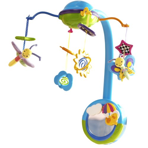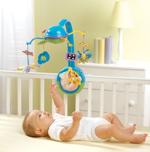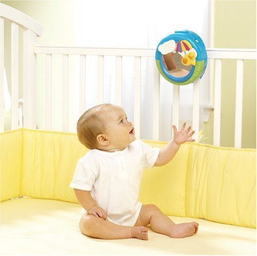 Birth & up. Babies drift off to sleep as they listen to the 5 melodies or watch the 8 hanging toys dangle from above. A large mirror will also stimulate and entertain baby. The base can convert to a crib toy for another use. Uses 3 C batteries, not included.