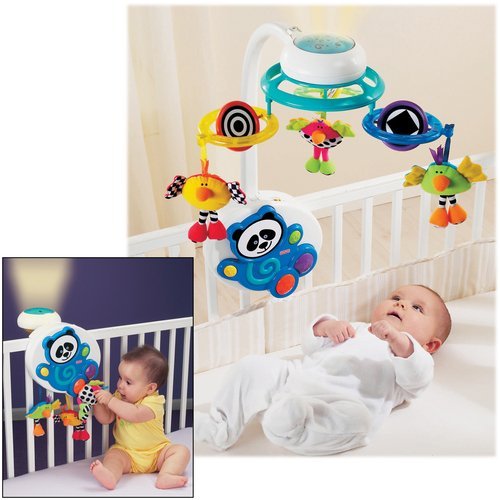 Change this mobile to suit your baby's age and mood, anytime! Combine soft lights, motion and music, choosing four lullabies or four classical favorites for up to 10 minutes of continuous play. Switch on a light show that dances on baby's ceiling. Flip reversible discs from high-contrast, black-and-white patterns to bright, colorful graphics. When baby outgrows the mobile, just remove that part and keep the music box on the crib and the projection on the ceiling. Measures 16.5W x 22H x 22D. Requires 3 C batteries, not included.