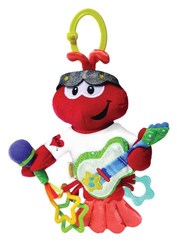 Keep little ones entertained and engaged with a playful pal. This rock star crustacean has a fun clacker ring, a big satin tail and plays If You're Happy and You Know It when the guitar is pressed. Battery included, but cannot be removed or replaced. Measures 11 x 5 x 7.