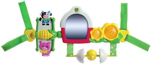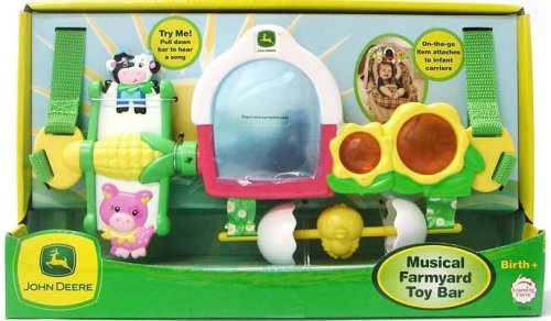 Activity bar by John Deere entertains and teaches baby while on the go. Attaches easily to infant carriers. Features a mirror, crinkle grass, spinner, music, which are activated by pushing on lever. Music rotates between 2 different 2 minute songs. Plenty to amuse baby as he grows while learning cause and effect.