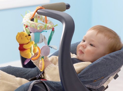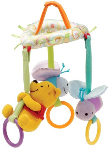Take-along mini mobile features Pooh and the bees and attaches to most baby carriers. Detachable characters include clinky rings and crinkle. Measures 5L x 8W x 5H.