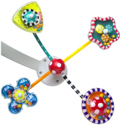 - four removable toys with different designs on top and bottom that can be reversed for age