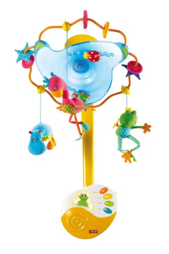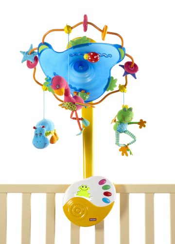 This innovative mobile intrigues, calms and entertains. It features a cute pond at its center, and a friendly trio of hippo, flamingo and frog revolves steadily as a ladybug and turtle create their own contrasting movements, zigzagging around and captivating baby's attention. The glowing pond creates a calming atmosphere that doubles as a pleasant night light. Mobile features twenty minutes of continuous music with four melodic tunes (two classical and two nature). Uses 3 C (LR14) 1.5V batteries (not included). Measures 15 x 14 x 5.