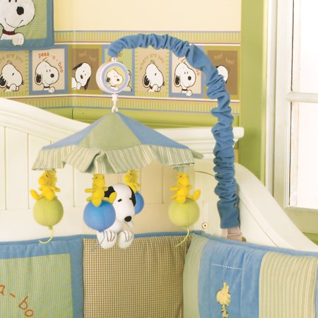 Snoopy and Woodstock spin beneath a multi-colored canopy while sweet music plays to help baby drift off to dreamland. Coordinates with the Peek-A-Boo Snoopy bedding collection.