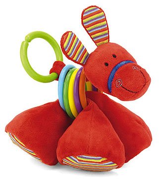 This is a cute toy. It\'s head and feet will get mixed up because of the way they sit in the rings. It is also a true orange color, not reddish as the picture shows. It\'s a soft plush with crinkly feet and ears. I bought it for a friend who is having a baby, so I don\'t know how baby friendly it is yet.