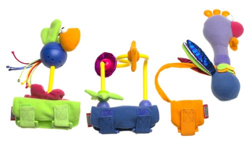 This set of three individual and very unique activity toys for baby's stroller bar will keep baby busy and entertained, while fostering learning and enjoyment over several developmental stages. The detachable toys may be rearranged on the stroller bar to hold baby's interest. Rearranging the toys also provides new developmental challenges as your baby grows, such as switching certain activities or motor skills from the right to the left hand.