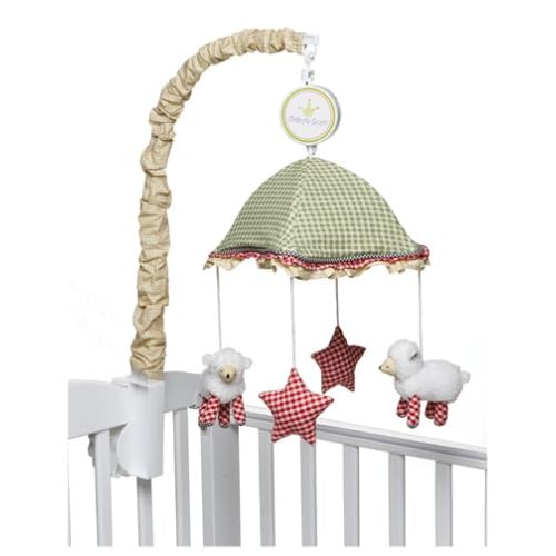 Four darling plush animals hang from a multi-colored canvas while sweet music plays to soothe baby to sleep. Coordiantes with the Tropical Punch bedding collection.