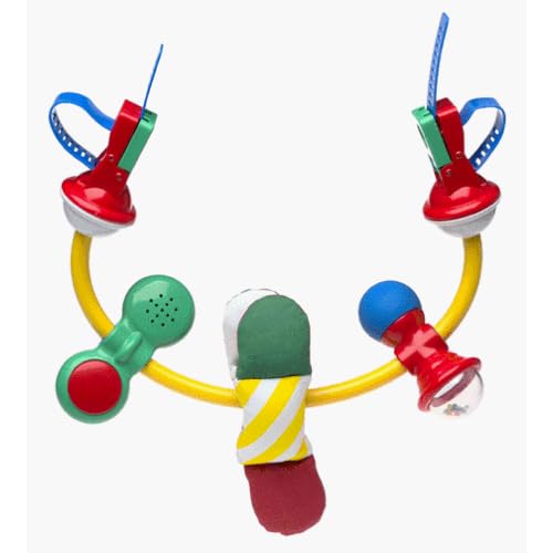 Flexible stroller toy. A unique strap and clasp attachment hooks onto stroller. Bar contains rotating prism, fun sounds from electronic sound chip, rotating domes, mirrors with beads, squeaking ball and fabric ring for chewing.