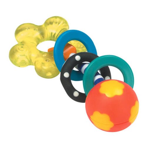 Baby will love to grasp the Coolin' Droolin' while exploring the multiple textures. Rings click-clack back and forth. Place this colorful teether in the refrigerator for cool sensation. Recommended for ages Birth+. Approximate size: 6 x 2.75 x 1.5.