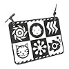 Babies up to six months respond best to visual black and white. This reversible Bright Starts Car Activity Center features bright black, white and red, bold graphics with friendly faces, geometric patterns, a baby-safe mirror, and vinyl pockets to hold photos or flashcards. There are many sets of two-in-one activities. This Car Activity Center easily attaches with Velcro,around the front seat of your car and will hold your small traveler occupied while you are driving.